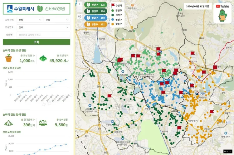 2024년에는 곳곳에 조성한 새빛수원 손바닥정원의 정보를 한눈에 볼 수 있는 온라인 지도 ‘지도로 보는 손바닥정원’을 구축했다. 손바닥정원 위치가 수원시 지도 위에 점으로 표시돼 있다.